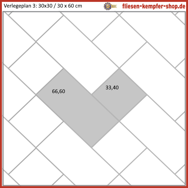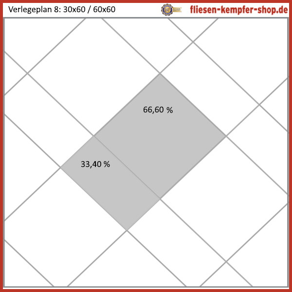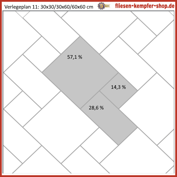 Die angegebenen Prozentualen sind die Fliesen-Bedarfsmengen nach den üblichen Durchschnittswerten. Sie können je nach Raumgrößen variieren. Bitte beachten Sie, dass bei den unterschiedlichen Verlegearten der Fliesenbedarf etwas höher sein kann.