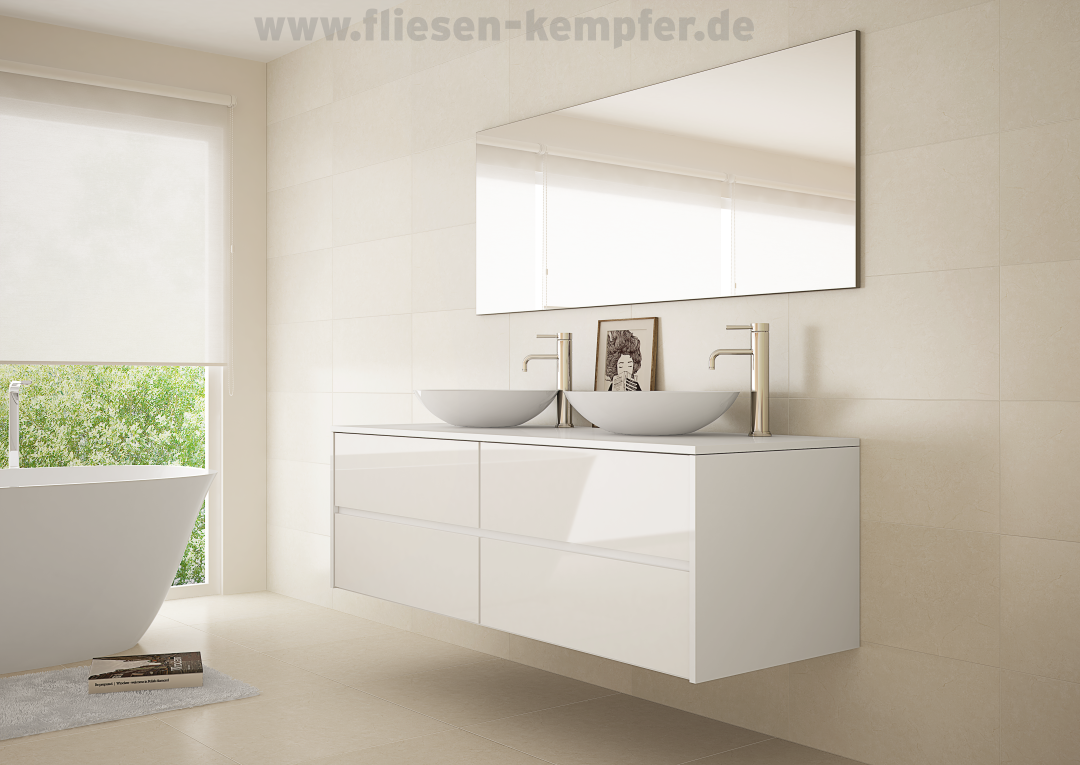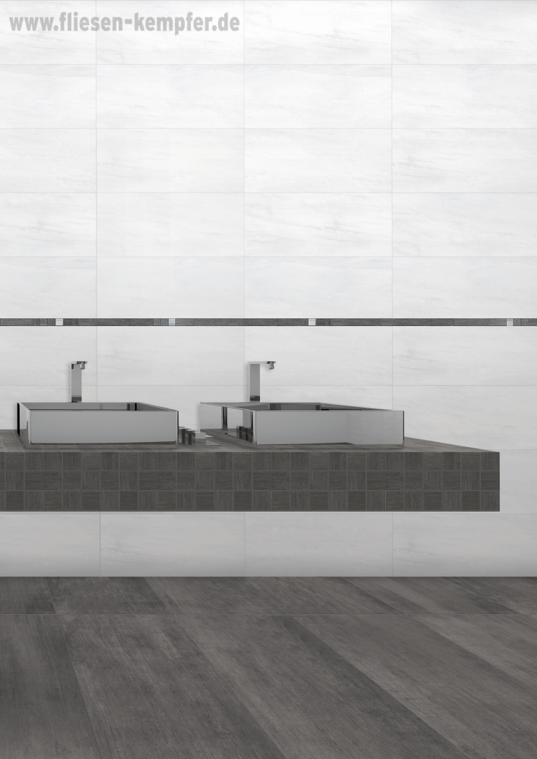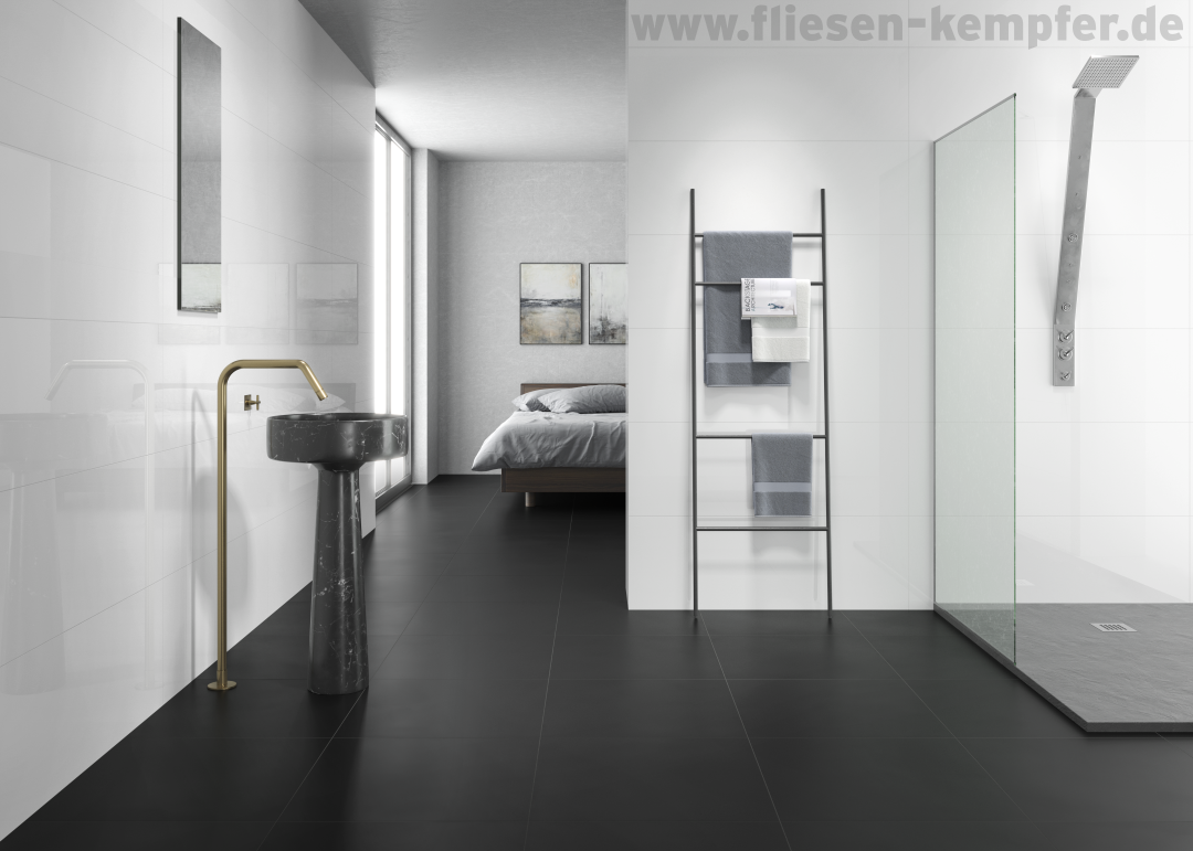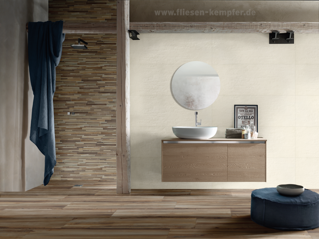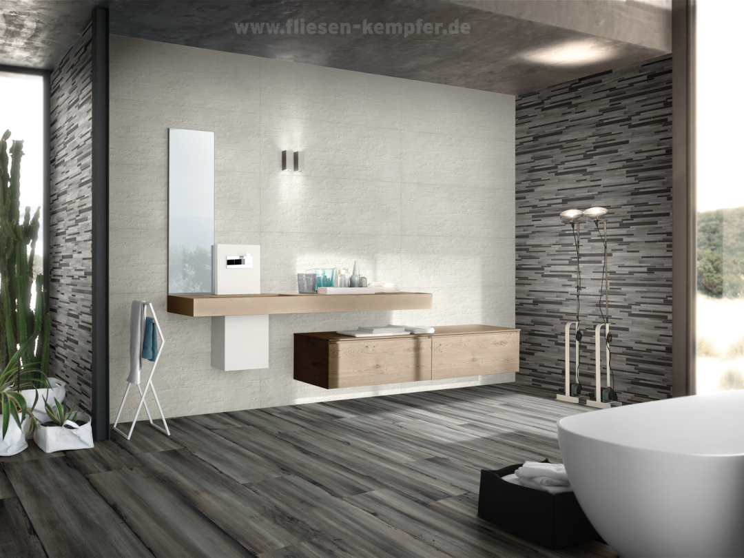 Ein weiterer Belastungsbereich für eine Wandfliese ist neben der Küche z.B. das Badezimmer. Hier ist eine Fliese zwar das ideale Material, weil es grundsätzlich leicht zu reinigen, robust und mit der passenden Fuge sogar wasserdicht ist. Überlegen Sie es es gut, ob eine oft bebilderte Teilbefliesung wirklich sinnvoll ist. Gerade in kleineren Räumen ist der Wechsel von Materialien immer mit optischen Brüchen verbunden. Damit sich auch kleine Räume ganz groß "anfühlen", ist die Auswahl der richtigen Wandfliese und die perfekt passende Bodenfliese hier besonders wichtig.