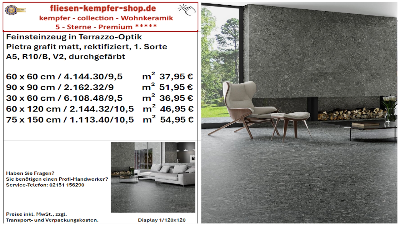Feinsteinzeug in NatursteinoptikDekorfliese Voltere grau, 1. Sorte60 x 120 cm, rektifiziertA5 / R10/A+B, 7 mm3 Stück = 2,16 m² / KartonDie keramische Fliese Voltere ist mit Ihrer Natursteinoptik ein Hingucker in Ihrem Heim. Die ebene Oberfläche sorgt für ein natürliches undauthentisches Aussehen mit Charakter und Charme. Ob an Wand oder Boden spiegelt dieses Feinsteinzeug naturnahe Gemütlichkeit mit gehobenem Wohnstil.Durch die perfekte Oberfläche ist diese Fliese pflegefreundlich, robust und langlebig. Dies spricht für hochwertige Qualität.Ihre Entscheidung pro Fliese ist nachhaltig und umweltbewußt.Absolut umweltfreundlichGestaltungsvielfaltRobuste Feinsteinzeug-Qualität!Einsatzvielfalt an Wand und BodenFleckunempfindlichMaximale Wertigkeit